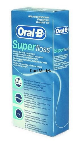 Nić Super Floss idealnie nadaje się do czyszczenia aparatów ortodontycznych, mostów i większych przestrzeni międzyzębowych. Jej trzy główne elementy - usztywniony koniec, puszysta część oraz standardowa nić, pomagają uzyskać uczucie maksymalnej świeżości.