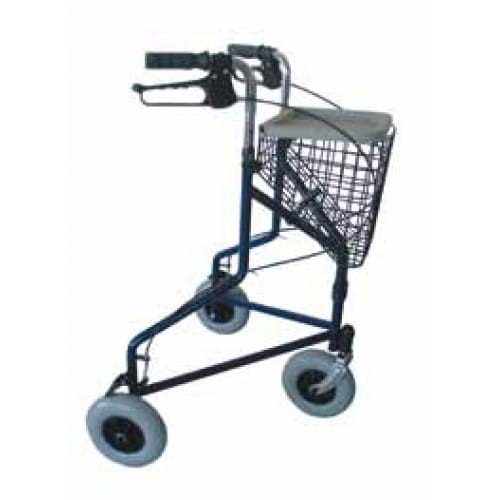Podpórka trójkołowa składana wyposażona w zdejmowany koszyk metalowy oraz polipropylenowy blat, dwa hamulce z systemem blokującym.