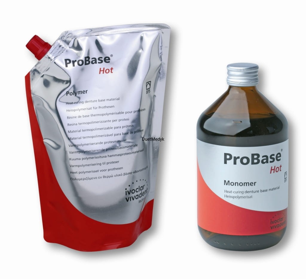 ProBase Hot materiał akrylowy polimeryzujący w podwyższonej temperaturze.Wprowadza nowy standard jakości dla ruchomych protez wykonywanych w technice puszkowania . Właściwości fizyczne i mechaniczne materiału gwarantuja łatwość oraz niezawodność pracy niezależnie od wybranej techniki polimeryzacji.